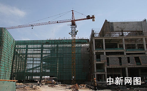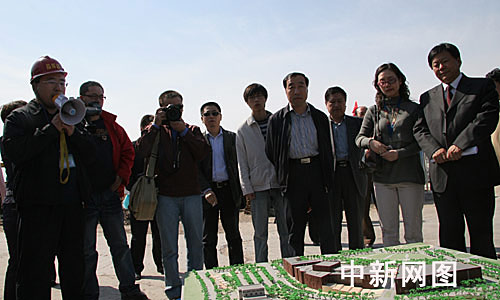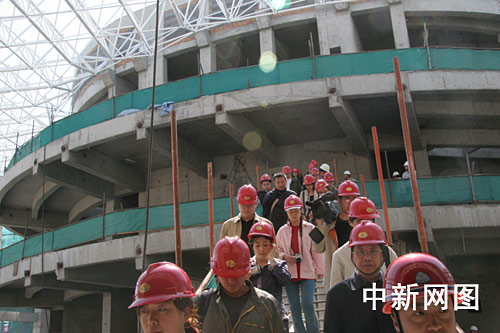 2006年5月12日上午,“网上看大庆”采访团在中共市委宣传部领导陪同下,参观了大庆市的在建重点工程。图为13家网络媒体的记者参观正在建设中的大庆市教育文化中心。