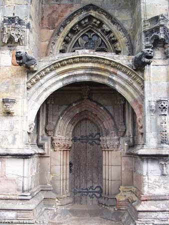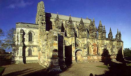 在全球销量逾五千万本的《达芬奇密码》,第一百零四章(倒数第三章)讲述主角成功破解密码、打开第二重藏密筒后,发现“The Holy Grail 'neath ancient Roslin waits”(古老罗斯林下圣杯静待)的字条,由于Roslin正是Rosslyn的古字,所以男、女主角两人便由伦敦乘内陆机直驱爱丁堡赶赴罗斯林教堂解开终极谜团。正因小说的品题,令本来十分宁静的罗斯林教堂骤然成为旅游热点,我也随着众多游人的脚步,选择较舒适写意的途径,由伦敦乘坐备有独立卧室的夜行火车前赴爱丁堡,在清晨的一抹彩虹引领下,我便怀紧张而兴奋的心情向罗斯林教堂进发。