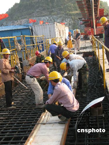 五月十七日,在三峡大坝最后一仓混凝土浇注的二号非流溢坝段上,工人们在加紧施工。二00六年五月二十日十时,长江三峡大坝右岸大坝将建设到一百八十五米高程。据介绍,右岸大坝目前仅剩下三十米长、二十米宽、三米深的二号非流溢坝段浇注工程量,只要千余立方米的混凝土浇注下去,三峡大坝即全线建成。中新社发 王士斌 摄