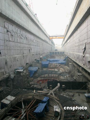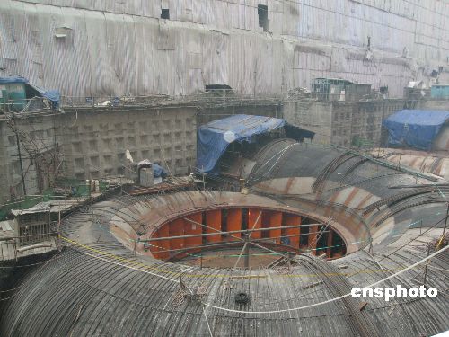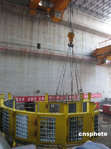 五月十七日,三峡大坝右岸电站正在吊装发电机组定子机座,其直径有二十二米,共五瓣,单瓣重三十八吨。三峡大坝右岸电站目前开始首批发电机组安装,将有十二台发电机组于二00七年八月开始发电。中新社发 艾启平 摄