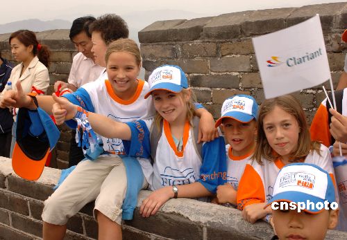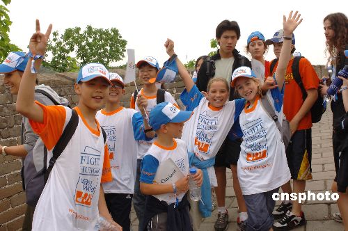 五月二十一日上午,联合国世界粮食计划署和中国农业部的官员、北京高校和北京国际学校的中外师生家长、企业界合作伙伴的员工 一千人,在北京的慕田峪长城之上,加入全球同步举行的“向饥饿宣战--行走天地间”的慈善义走活动。图为北京国际学校的中外师生,在长城上为“向饥饿宣战”而高呼。中新社发 邹宪 摄