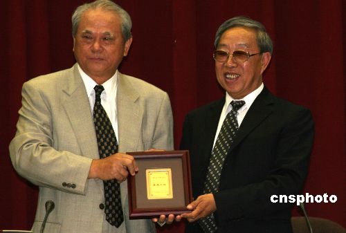 五月二十二日,二○○六海峡两岸“数位出版产业化发展研讨会”暨“数位出版及数位典藏成果观摩展”在台北市立图书馆举行。图为台北市出版商业同业公会理事长彭诚晃先生向中国出版工作者协会副主席兼秘书长谢明清先生颁发纪念奖牌。中新社发 张量 摄
