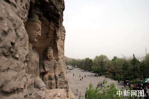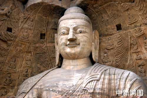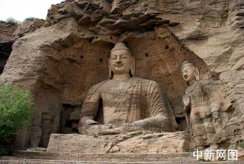 图为云冈石窟第20窟的坐佛,是云冈最著名的露天大佛。据推测,他是依照北魏开国皇帝道武帝的形象雕刻的,似一位阅尽沧桑、雄才大略的长者,在阳光下俯视人间。正因成了露天雕像,所以虽是坐姿,却仍显得分外高大。并且由于可以远视,更境加了他的庄严肃穆之感。大佛全身比例适称,造型手法简练概括,他宽阔的身躯给人以稳健之感,他所据有的佛的“三十二相、八十种随形好”的精神风貌,为这一时期佛像雕刻的杰出代表。他微微前倾的身躯和棱角分明的嘴角,仿佛在向众生宣讲着佛教的真话,他那细细的弯眉和微启的双目,使人感到慈祥为怀的气度,他不仅是云冈石刻中的杰作,即在全国来说,也是佛像艺术中的精品。