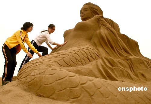 五月二十二日,两名游客在新疆库姆塔格沙漠风景区欣赏刚刚完成的“美人鱼”沙雕作品。新疆吐鲁番鄯善县库姆塔格沙漠风景区的“中国沙雕艺术城”,为迎接将于六月在此举办的新疆国际旅游节和中国丝绸之路吐鲁番葡萄节,正在制作二十四座沙雕新作品,目前已有部分制作完成。中新社发 刘新 摄