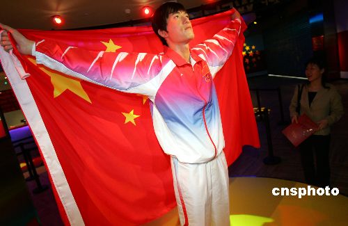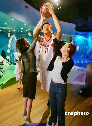 “姚明”亮相杜莎夫人蜡像馆两位应邀前来上海杜莎夫人蜡像馆参观的女记者,被栩栩如生的姚明蜡像所吸引。而“刘翔”同样让人难分真假。中新社发 汤彦俊 摄