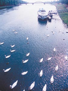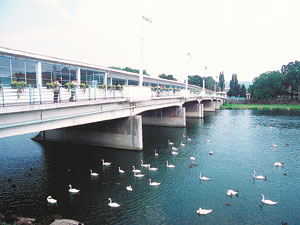 温泉浴室聚集在瓦赫河中的小岛上,这里仅准行人及自行车通行,不管行走或骑车都格外舒服。走到桥中央,看着波光粼粼的河面,连天鹅都悠闲的在河上漂浮,河边草地上有人正享受和煦温暖的日光浴。这里的调性缓慢而舒适,颇适合作为安心疗养的地方。