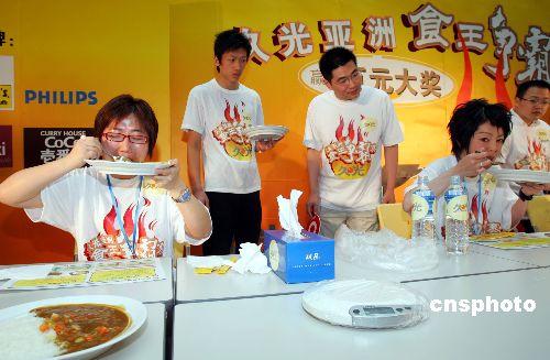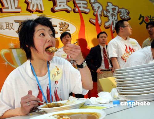 五月二十八日,“久光亚洲食王争霸赛”决赛在上海进行,来自香港的“女大胃王”蒋咏雯(左)与日本“竞食天后”岩田美雪一争高下,争夺亚洲“女大胃王”称号。最终,岩田美雪在二十分钟内吃下十二盘近六千克的咖喱饭,获得本次比赛冠军。中新社发 汤彦俊 摄