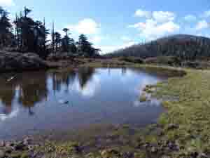 第二次来到香格里拉碧沽天池,和四年前相比没有太大变化。几间藏民的放牧房,空空荡荡,看不见昔日从牧民房中冒出的缕缕炊烟,也听不到打酥油茶的木桶敲击声。陪我们来的老人说季节还早,放牧的藏民还没回到这里。天池周围一片寂静,除了风声,偶尔听到几声野鸭的鸣叫。