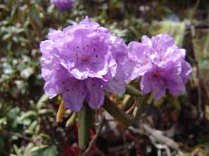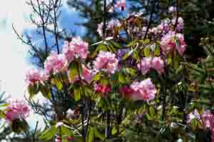 在天池湖边有近百亩的樱草杜鹃,花色呈紫兰和粉红。听老人说这些花要到六月初才会完全开放,而今已有星星点点的樱草杜鹃开出了紫兰的花朵,这些杜鹃树干小,随地衍生,色泽浓郁,并有淡淡清香。天池周围还有各种叫不出名的野花,黄的、粉的、紫的、白的五彩缤纷。在天池南面的沼泽地带,远远看去有几只黄鸭在湖面上嬉戏,当我们走近时,它们就扑腾着飞走了。