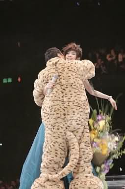 据香港媒体报道,因为每场演唱会都会安排周慧敏的猫儿子周慧豹公仔上台合照,但前晚上台的周慧豹既向周慧敏献花,又抱着周慧敏不放,连嘉宾古巨基也不放过。古巨基更出手脱下周慧豹的头套,竟发现此人是倪震。周慧敏没想到男友有此一招,被吓得尖叫退后,随即感动落泪。倪震跪地伸开双手作拥抱状,周慧敏上前拥着男友,两人更当众亲嘴,场面感人。