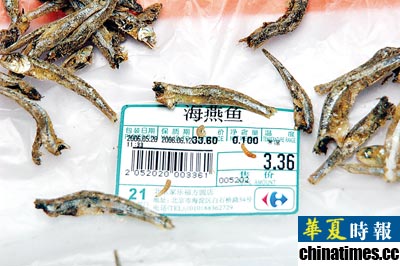 读者投诉:“在家乐福超市方圆店盛咸鱼干的玻璃陶里,有上百条蠕动的虫子,都贴在玻璃内壁上,有的还在鱼干身上爬来爬去。简直就像80年代的公共厕所,到处爬满了蛆。”