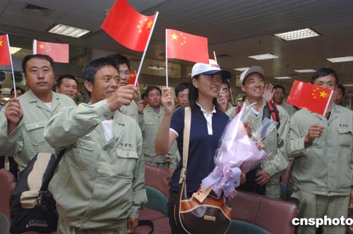 五月二十九日晚九时三十分,243名在东帝汶骚乱中受困的华侨华人分乘两架中国政府包机安全抵达厦门。其中十六位山东省外经集团在东帝汶执行援建工作的工程技术人员感谢中国政府对他们的及时援助。中新社发 郑祚声 摄
