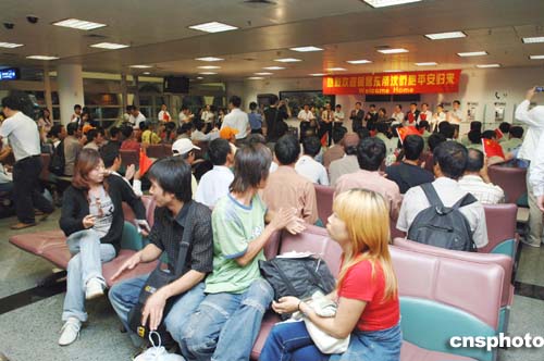 五月二十九日晚九时三十分,243名在东帝汶骚乱中受困的华侨华人分乘两架中国政府包机安全抵达厦门。他们在机场受到政府官员及有关人士的迎接。中新社发 郑祚声 摄