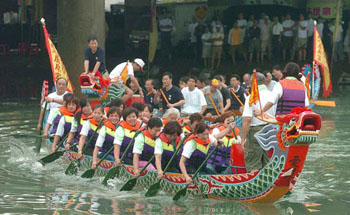 岛内洲美文化祭端午龙舟竞渡31日热闹开锣,由婆婆妈妈组成的女子龙舟队,在清一色由男性领军的队伍中格外抢眼,虽然比赛成绩不尽理想,但志在参加的大伙仍乐在其中。(台湾《中国时报》图 王爵暐摄)