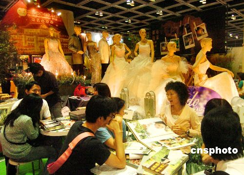 香港将于六月二日在会展中心举办第四十三届婚纱商展,今年夏季这个最大型的婚纱商展上港台婚纱名店云集,会展将推出时尚婚纱、婚庆用品、珠宝首饰、中西礼品及婚庆、婚宴、婚纱策划、摄影等服务项目,期间将举办国际足球明星坐阵的世界杯婚纱、婚姻监礼坐谈会、名模婚纱大会演、创造完美新娘等活动,商展为期三天,商家云集。目前展厅内各项准备工作紧锣密鼓。中新社发 宋吉河 摄