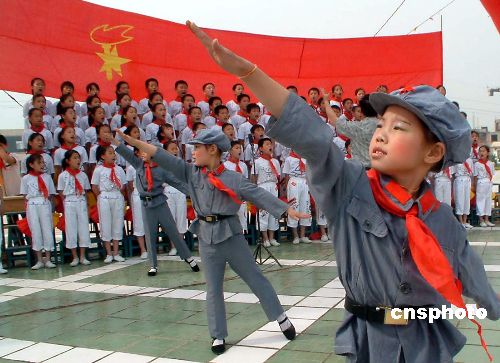 山西新绛县纺织厂子弟学校小学生合唱队在表演“党的光辉照我心”歌舞。中新社发 高新生 摄