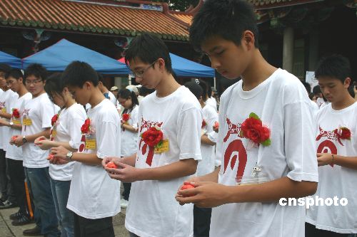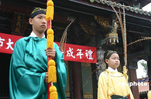 六月四日,台北数十位年满十八岁的青年学生在台北孔庙参加一年一度的成年礼。鸣炮、奏乐、敲钟、擂鼓、上香祝祷等传统仪式出现在典礼中。中新社发 曾嘉 摄