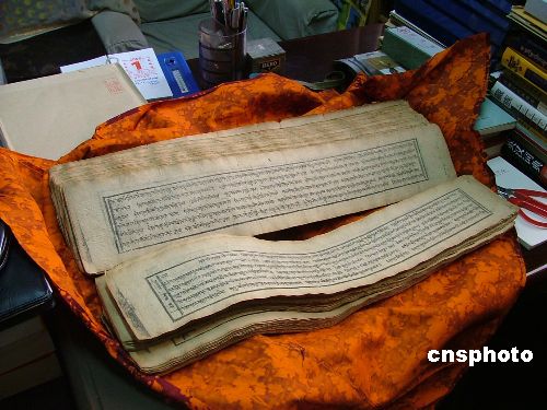中国历史上首次全面系统对勘藏文《中华大藏经》工作已经历时二十年,目前已经取得的阶段性成果包括:全部一百二十四部(含四部目录)的《丹珠尔》已经对勘成功。图为中国藏学研究中心展示的对勘前的藏文《大藏经》长条书。中新社发 徐长安 摄