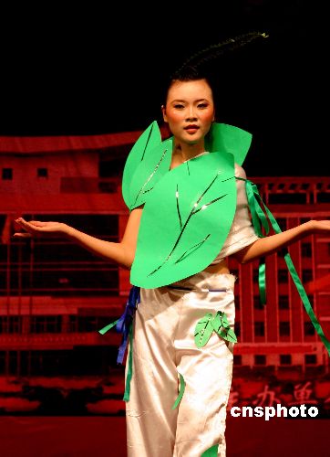 2006年6月4日晚上,湖南省娄底职业技术学院进行环保时装秀表演。世界环境日前夕,湖南省娄底职业技术学院的大学生们利用纸、光碟、布等废旧物品,亲自动手制作了形态各异的比赛环保服饰,旨在通环保时装秀比赛,提高广大公众的生态安全意识和参与维护生态安全的积极性,宣传环保、循环节约、保护地球人类的家园,倡导绿色消费,资源循环利用,共建环境友好型社会。中新社发 郭国权 摄