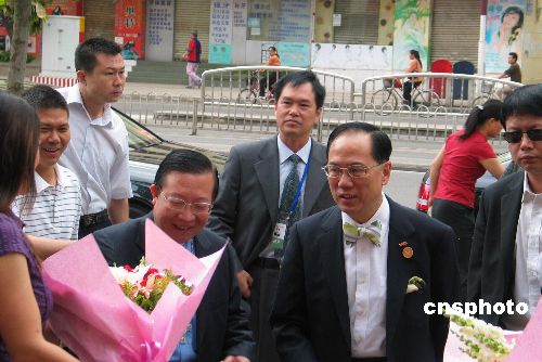 六月五日,第三届泛珠三角区域合作与发展论坛在距昆明市近两百公里的珠江源头开幕。上午七点三十分,香港特首曾荫权利用乘坐专列前往珠江源头的短暂时间,和夫人一同前往位于昆明市北京路的天主教堂做弥撒。图为昆明教区主教马英林在教堂门口迎接曾荫权。中新社发 董天 摄