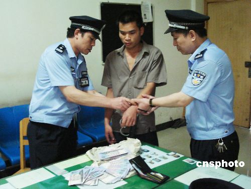 2006年6月3日,柳州火车站派出所民警在火车站售票大厅内查获39,300元1990年版的元假人民币。目前,犯罪嫌疑人已被柳铁公安机关刑事拘留。此案还在进一步审查中。中新社发 杨子江 摄