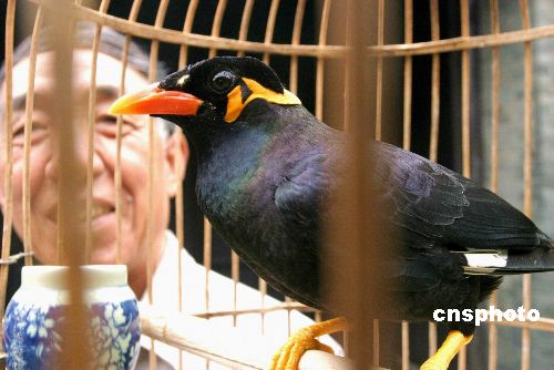 6月8日,江苏省海安县博物馆内一只由工作人员饲养的鹩哥鸟正在与人“对话”。它能“说”20多句简单语句,如“您好”、“老王,接电话”、“再见”、“老爹,恭喜恭喜”等,每句话都发音准确、清晰婉转动听,模仿轮船气笛和人的笑声更是惟妙惟肖。中新社发 仇稳山 摄