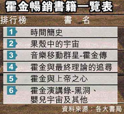 虽然只有二千五百人能亲身参加霍金的讲座,但仍阻不了市民追捧霍金的热情,与霍金有关的书籍,销情更“打低”畅销书《达文西密码》。商务印书馆文化统筹主任刘美儿指出,当知道霍金会来港访问后已开始部署入货,书种多达六十多种,她说:“最好卖的是《时间简史》及《果壳中的宇宙》两本,其中《时间简史》只余下简体版本,繁体及英文版已售罄。”刘美儿补充,霍金部分著作虽然已是十年前出版,但销量仍然凌厉,料未来几天与霍金有关的书籍将会继续大卖。
