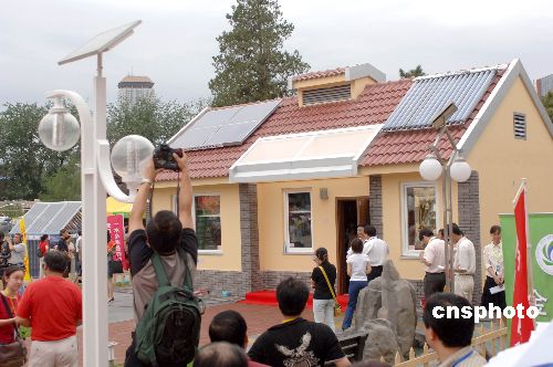 | 六月十三日,由北京市政府主办、中国国家环保总局支持、北京市发展改革委承办的“2006北京节能环保展览会”,在北京全国农业展览馆开幕。这是在国家“十一五”规划开局之年,推动“建设资源节约型、环境友好型社会”的一次盛会。推介了一批适合家庭使用的节能环保产品进行展出。图为由四十家单位,组合制作了一幢四十平米的“节能、环保住宅”,供来宾参观。该住宅使用了绿色建材、中央液态冷热源环境等系统,其一砖一瓦,每个构件,都体现了该展会的精华,博得观众赞扬。中新社发 邹宪 摄