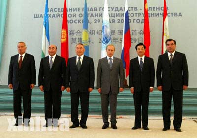 2003年5月29日,上海合作组织第三次峰会在莫斯科举行。中国国家主席胡锦涛和哈总统纳扎尔巴耶夫、吉总统阿卡耶夫、俄总统普京、塔总统拉赫莫诺夫、乌总统卡里莫夫出席。