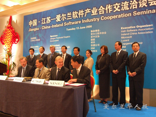 在江苏投资的朗讯公司在会上介绍了江苏软件产业发展的优越条件及在南京投资建立软件研发中心的情况,微软公司介绍了与江苏加强合作的具体情况,并向与会人士推介了江苏的投资环境,南京联创科技股份有限公司介绍了江苏本土软件企业的成长历程。会议开始前,在爱尔兰考察访问的江苏省内软件企业与爱尔兰有关单位进行了对口洽谈,部分单位达成了友好合作意向。会上,江苏省信息产业厅、南京联创科技分别与全球最大的管理及IT咨询服务企业之一凯捷管理咨询公司,江苏软件园与都柏林理工大学、南京大学软件学院与爱尔兰国家软件工程中心分别签署了在信息服务业、软件外包、人才培养等方面的合作协议。