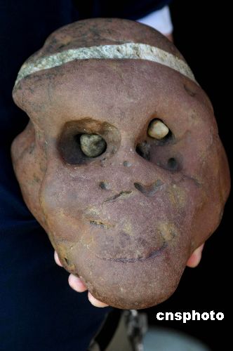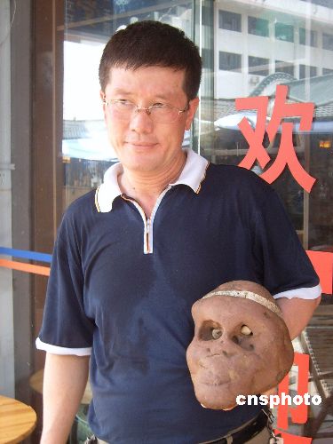 桂林市民常文金在广西兴安县灵渠漓江源头打捞出一布满青苔的鹅卵石,经清洗后惊奇地发现此石酷似北京猿人头盖骨。曾有一美国游客出资一万四千美金欲购此石,但常文金甚爱此石,没有卖出。图为发现者常文金。中新社发 刘桂阳 摄