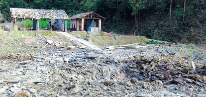 报道说,在爆炸现场可看到,先前平坦的地方现已被炸成一个直径长3米左右、深1米多的坑。在巨大的冲击力下,四周200米附近的七八栋房子都不同程度的受损,2栋土砖房间已被震倒。另两间红砖房上的瓦片无一幸存。以“起源地”为中心伸展的四个方向50米左右,植物已是光秃秃的一片。