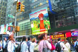在纽约著名的时报广场,一幅“2008北京-中国欢迎您”的巨幅广告吸引着过往行人的目光。这幅广告就是由中国驻纽约旅游办事处今年4月投放的,办事处祝善忠主任在接受《美洲时报》记者专访时表示,借助2008年北京奥运会的历史契机,中国旅游部门已经在纽约等主要的国际大都市采取多方位广告“轰炸”,强势推广中国形象,收到了良好的效果。