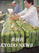 这种西瓜是在西瓜未长成之前,将它装进方盒子内培育而成的。虽然它的味道“和稍甜一点的黄瓜差不多”,不太适宜食用,但在日本作为百货店里的水果摊和公司入门接待处的装饰品却颇受欢迎。