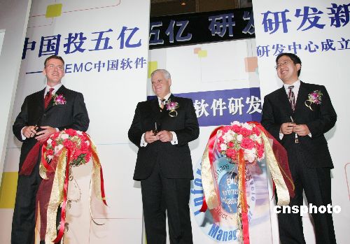 | 六月二十三日,EMC公司在北京召开以“中国投五亿 研发新机遇”为主题的新闻发布会,并宣布建立以上海为总部的最新中国软件研发中心的投资计划。EMC董事会主席、总裁兼首席执行官乔·图斯(中)、EMC公司副总裁、亚太及日本区总裁斯蒂夫·莱纳德(左)和EMC公司副总裁兼中国软件研发中心总经理范承工(右)博士出席了发布会。EMC是世界排名第一的存储和内容管理软件提供商,世界第七大企业级软件供应商,二零零五年排名中国存储软件榜首,占据了中国存储软件收入百分之三十九的份额。中新社发 武仲林 摄
