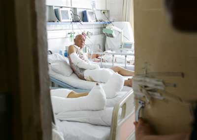 昨天下午,在右安门医院的重症监护室里,伤者陈某痛苦地躺在床上。陈某头发已被烧光,右胳膊和右腿缠着纱布,腹部有大面积烧伤的痕迹。他的全身大部分涂上了红褐色的药膏,嘴里不时吸着凉气,眉头紧紧地锁在一起。