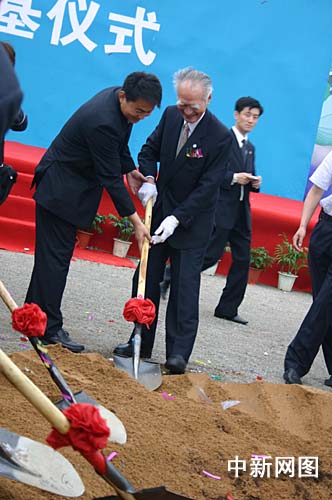 六月二十五日下午,在葫芦岛百万日侨大遣返的出发地--辽宁葫芦岛港,举行了"葫芦岛和平公园"奠基仪式,中国国务委员唐家璇和日本前首相村山富市等出席仪式,为基石铲土奠基,并和中外来宾一起在园内共同栽下了象征着友谊常青的松柏。当日上午葫芦岛百万日侨大遣返六十周年回顾暨中日关系展望论坛上,大连市九三学社原工作人员、当年中方遣返日侨工作人员王黎将自己女儿创作的的一幅中国画当场赠送给日本前首相村山富市先生。中新社发 金果林 摄
