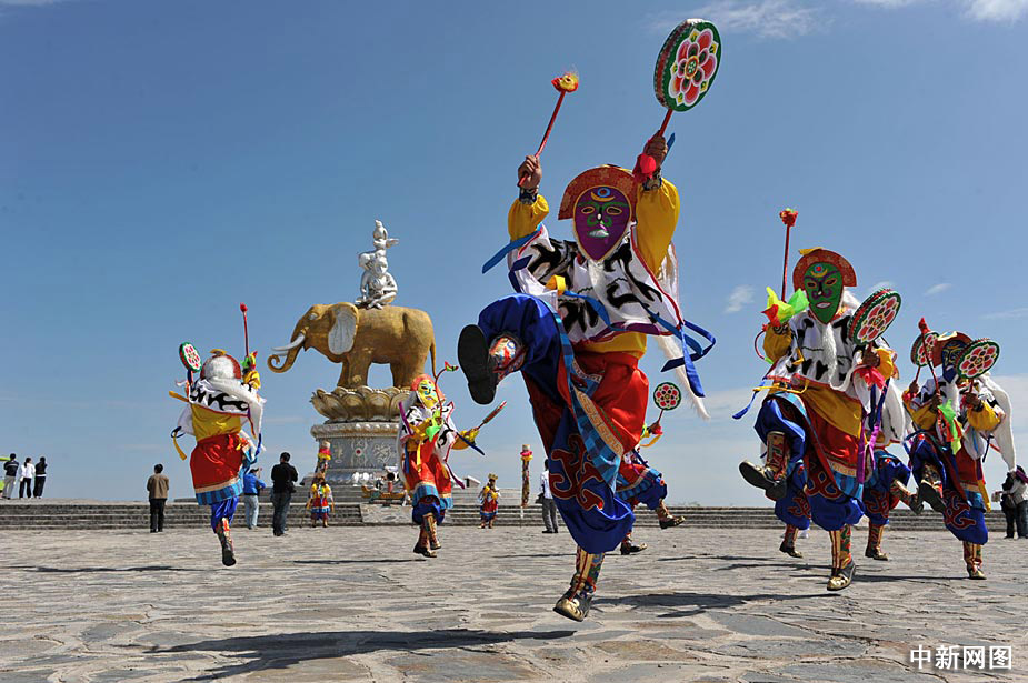 图为二郎剑景区的藏族同胞表演藏族舞蹈喇嘛法舞。