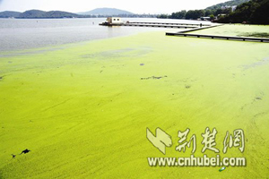昨日下午,不少市民路过东湖翘嘴至凌波门路段时,惊奇地看到,往日波光粼粼的湖面如今被大片的绿色物覆盖,看上去就像塑胶场。