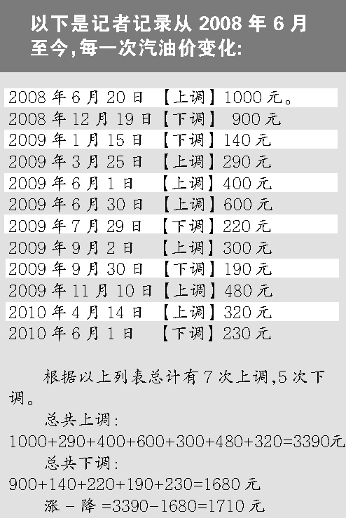 在帖子里,网友列出了从2008年6月至2010年6月,每一次国家发改委对油价的调整,得出结论是涨7次,降4次,每吨汽油的涨幅总额为3390元,而每吨汽油的降幅总额为760元,于是得出计算结论:2年前的油价是74美元,现在还是74美元,可是汽油价却涨了2630元1吨。