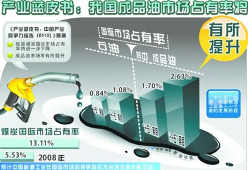 中国社会科学院22日在北京发布的《产业蓝皮书:中国产业竞争力报告(2010)》预测,我国煤炭国际市场占有率将进一步下降,成品油市场将有所提升。