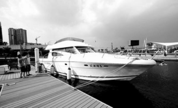 环渤海地区游艇业近年来迅速发展。天津市依托旅游业,在滨海新区中心渔港休闲港湾区兴建1000个游艇专属泊位,进一步加速游艇产业的发展。天津湾、东丽湖等10多个港口、湖泊水域也都建立了游艇泊位及水上项目基地。图为8月17日一艘游艇停靠在新建成的天湾游艇码头。 新华社记者 刘海峰摄