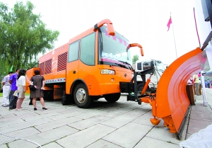 昨日,北京会议中心,观众在参观新型扫雪铲冰车。当日,“2010年北京冬季扫雪铲冰设备展示会”开幕。展会上一种不用融雪剂的环保除雪车首度亮相。本报记者 浦峰 杜丁 摄影报道