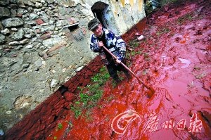 7日,在受泄漏影响的村庄,一名村民正在试图清理自家门前的泥浆。在受污染地区,表层两厘米的土壤都需要清除。 据报道,泄漏的泥浆属于炼铝废物,含铅等重金属,带轻微放射性。泥浆中腐蚀性物质可穿透衣物,灼伤皮肤。