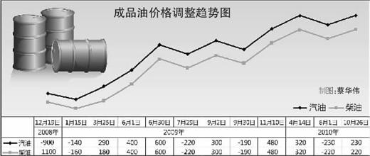 自2008年12月19日至2010年10月26日的成品油价格变化。负值为下调价格,正值为上调价格。