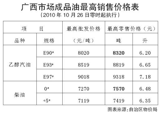 从今日零时起,广西成品油价格与全国同步提高,其中,E90#、E93#、E97#汽油的最高零售价分别每升上调了0.18元、0.19元、0.20元(提高后的汽、柴油最高销售价格详见附表)。