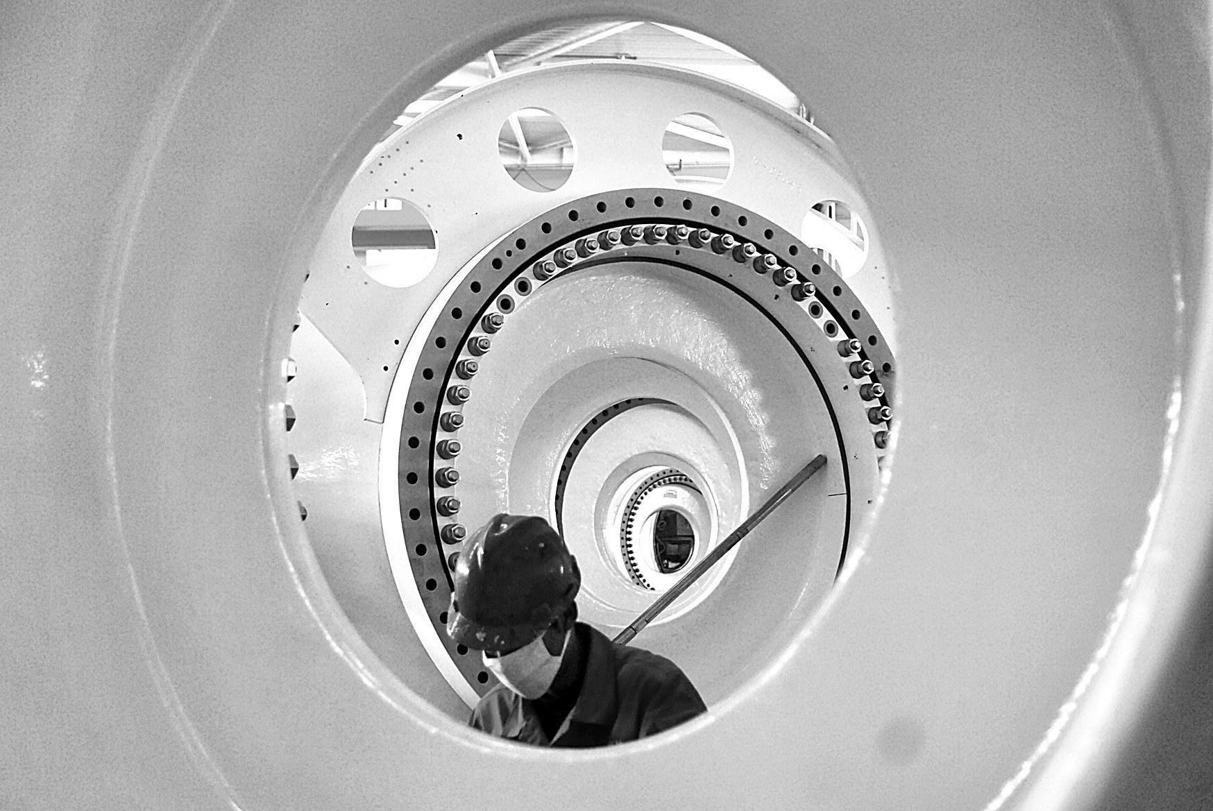新疆与西北750千伏联网工程、甘肃千万千瓦级风电一期外送工程3日建成投运,这标志着新疆电网自此结束了孤网运行的历史,甘肃千万千瓦级风电外送通道得以打通,使西北地区的水电、火电、风电“打捆”东送成为现实。图为一名工人正在对风力发电机组的叶轮轮毂进行检测。