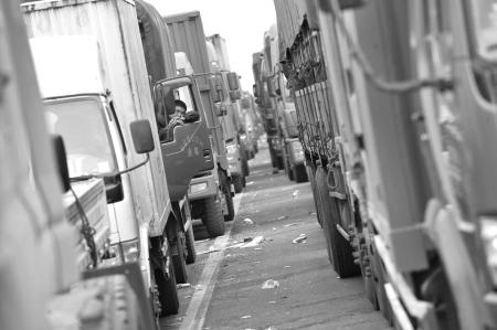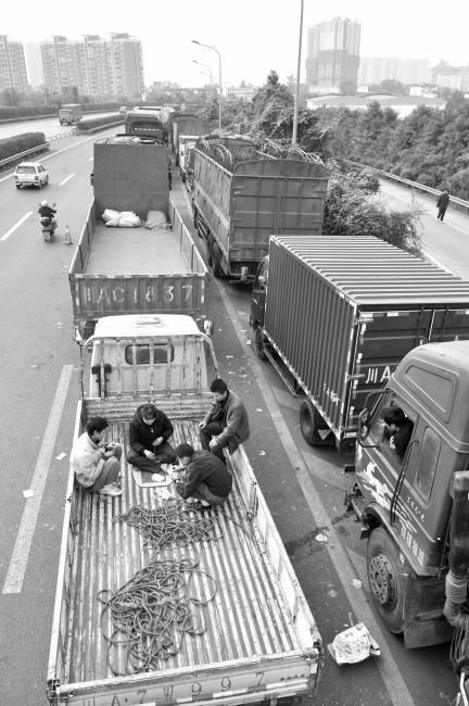 排队等加油的大货车司机只有以打牌来打发时间