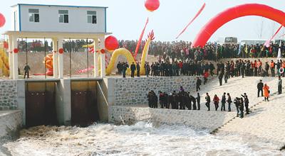 11月23日,在河北魏县第六店村西引黄穿卫左堤闸附近,四邻八乡的乡亲们观看滚滚而来的黄河水。