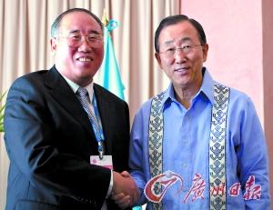 8日,正在坎昆出席联合国气候变化大会的国家发改委副主任、中国代表团团长解振华(左)与联合国秘书长潘基文举行会见。